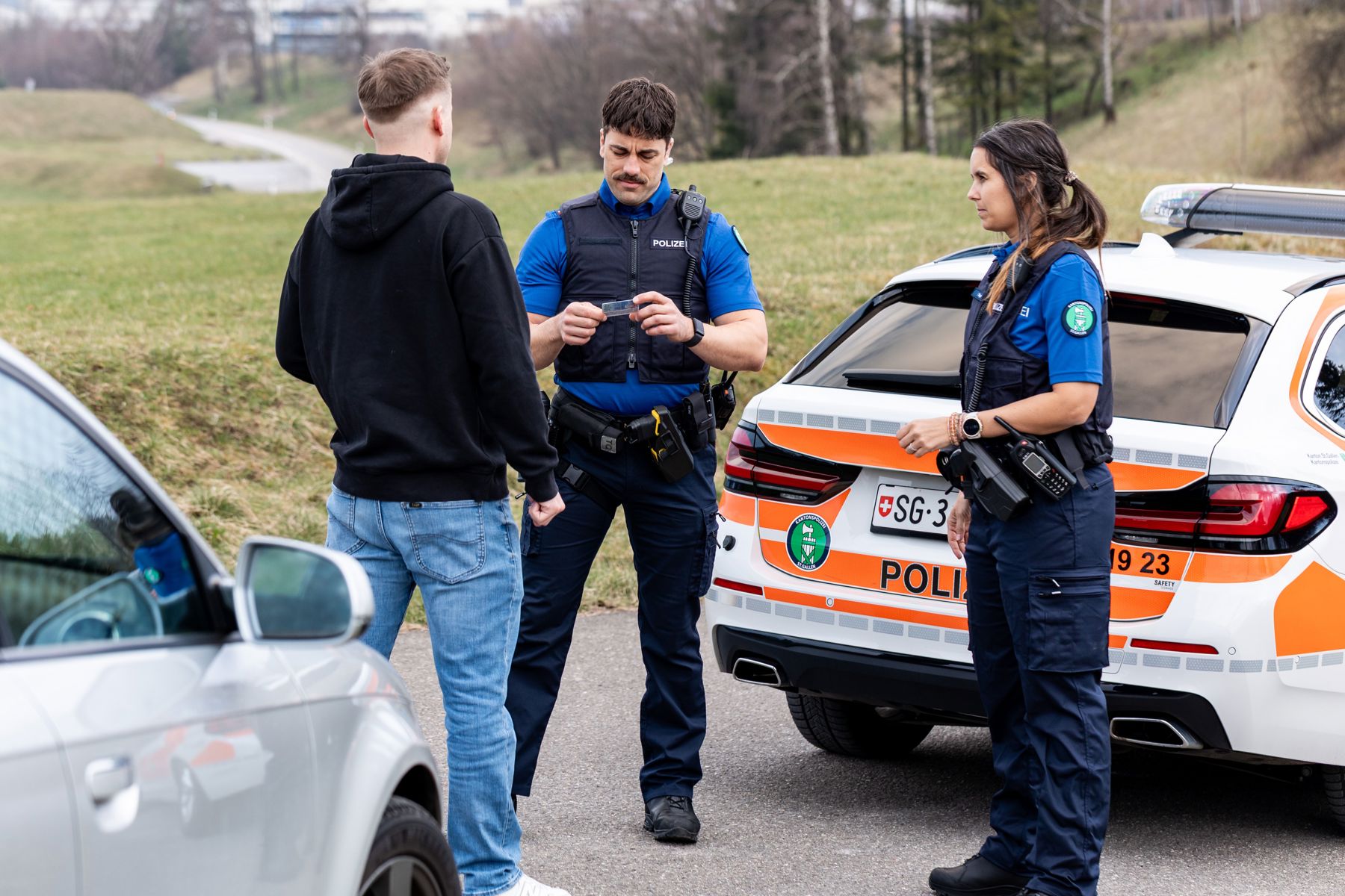 Kurz nach 17 Uhr fuhr eine Polizeipatrouille auf der Autobahn A1 von St. Margrethen Richtung St. Gallen. Auf Höhe St. Margrethen fiel den Polizisten ein Auto auf dem Pannenstreifen auf. Die Fahrertür war geöffnet und ragte in die Normalspur hinein, zudem sass ein Mann auf dem Fahrersitz und erbrach auf die Strasse. Die Polizisten fuhren mit dem Patrouillenfahrzeug ebenfalls auf den Pannenstreifen, um den Mann zu kontrollieren.