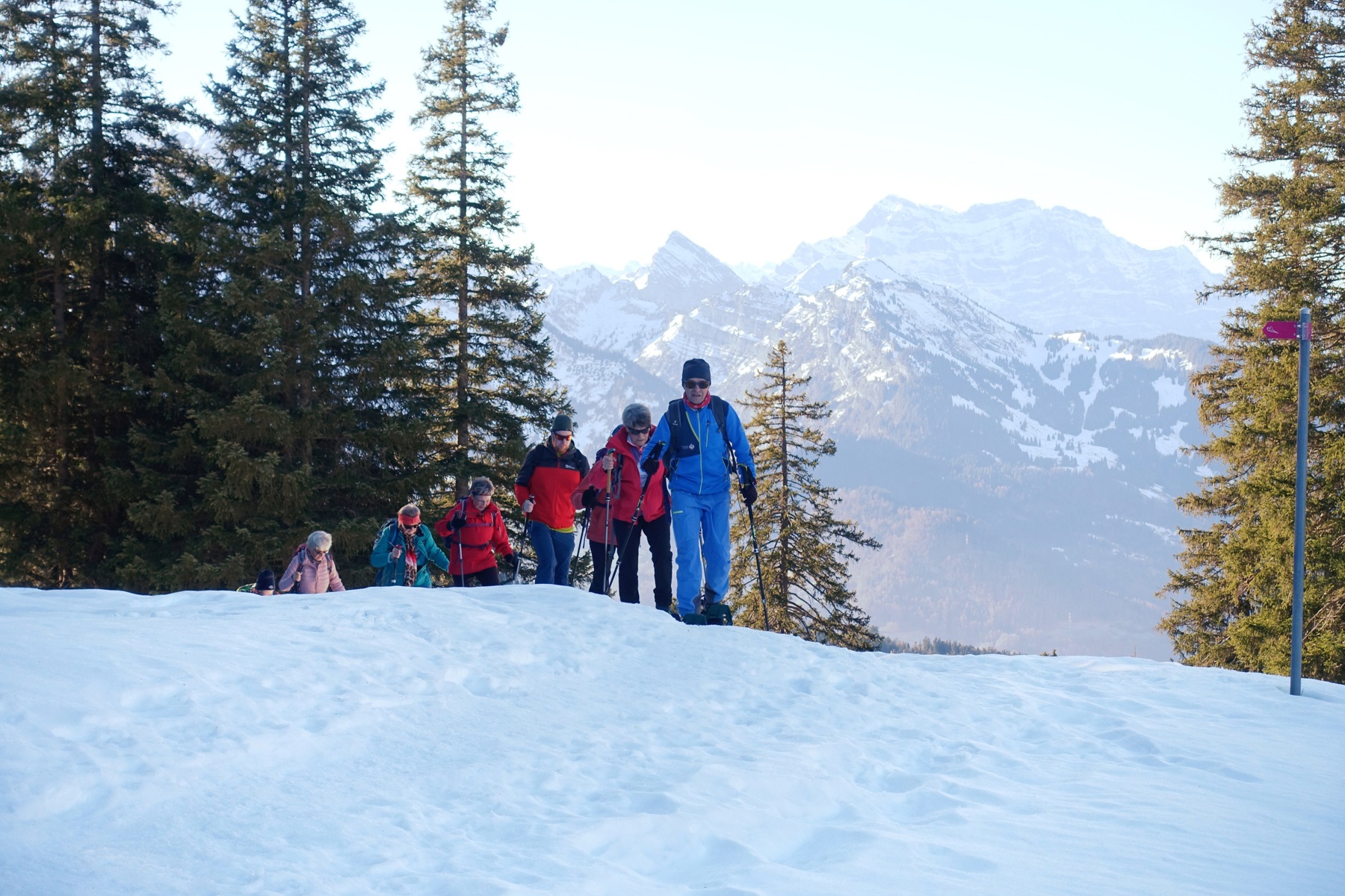 Trotz geringer Schneehöhe konnte grösstenteils auf Schnee gewandert werden, auch wenn im Arvenbüel noch mit geschulterten Schneeschuhen gestartet wurde. Nach den ersten Höhenmetern konnten die Schneeschuhe aber bereits angeschnallt werden. Über Alpen, vorbei an Alphütten und durch Wälder wanderte die Gruppe frohen Mutes und mit viel Freude zur Vorderen Höhi hinauf. Der Blick in die umliegende Bergwelt – zu den Glarner Alpen, hinüber zum Alpstein und zu den Churfirsten – war umwerfend!