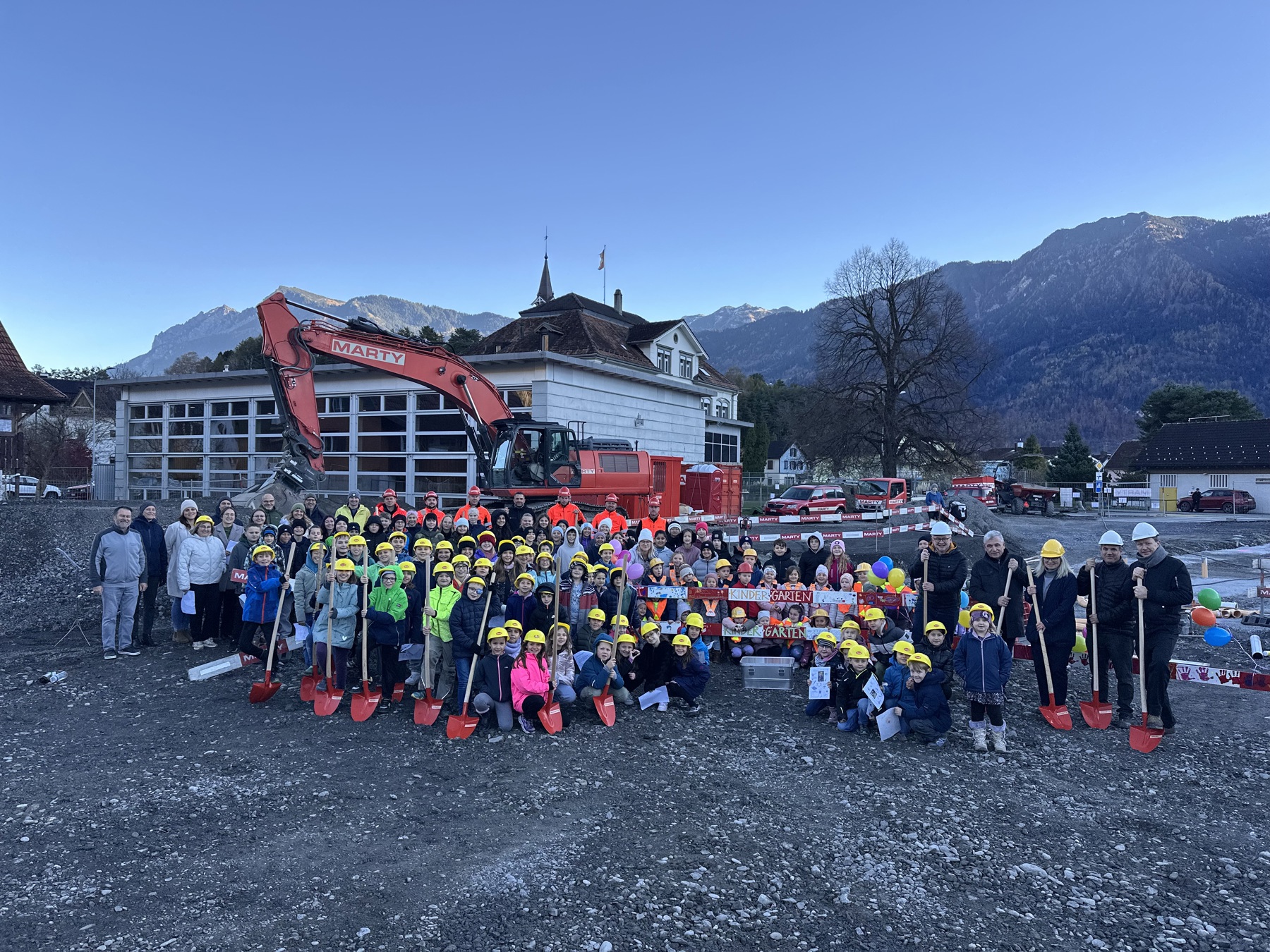 Vertreterinnen und Vertreter der Gemeinde, Lehrpersonen, Kinder, Eltern und Bauverantwortliche feierten gemeinsam den offiziellen Beginn der Bauarbeiten für das neue Schulhaus, das künftig den Kindergarten und die Primarschule beherbergen wird.