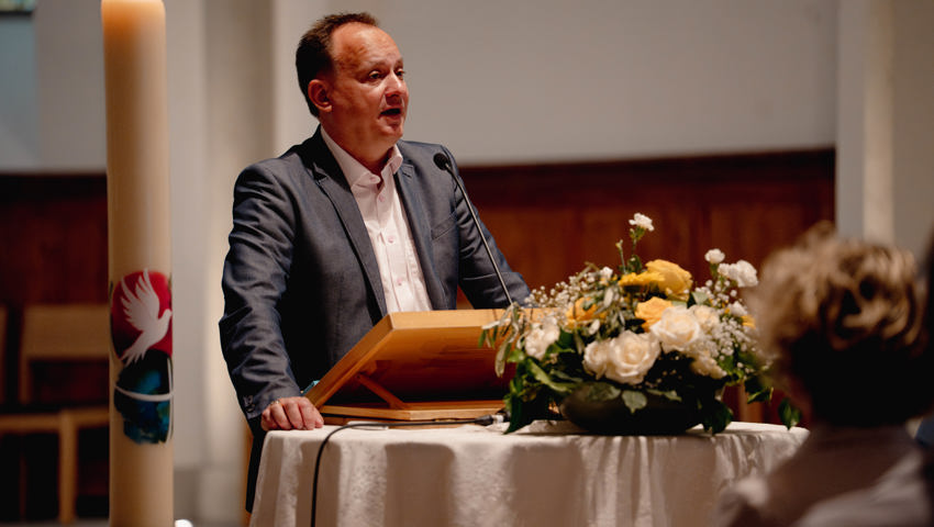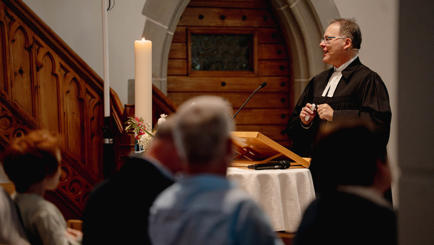 Pfarrer Martin Frey verwies mit einer Bildergeschichte auf das Fundament, auf welchem die Kirche steht und auf welchem es sich lohnt, das Leben aufzubauen. Bereits König Salomo hatte erkannt, dass Gott sich nicht in einen Tempel (bzw. eine Kirche) fassen lasse. Sein Haus ist dort, wo Menschen sich ihm zuwenden. Gott ist persönlich.
