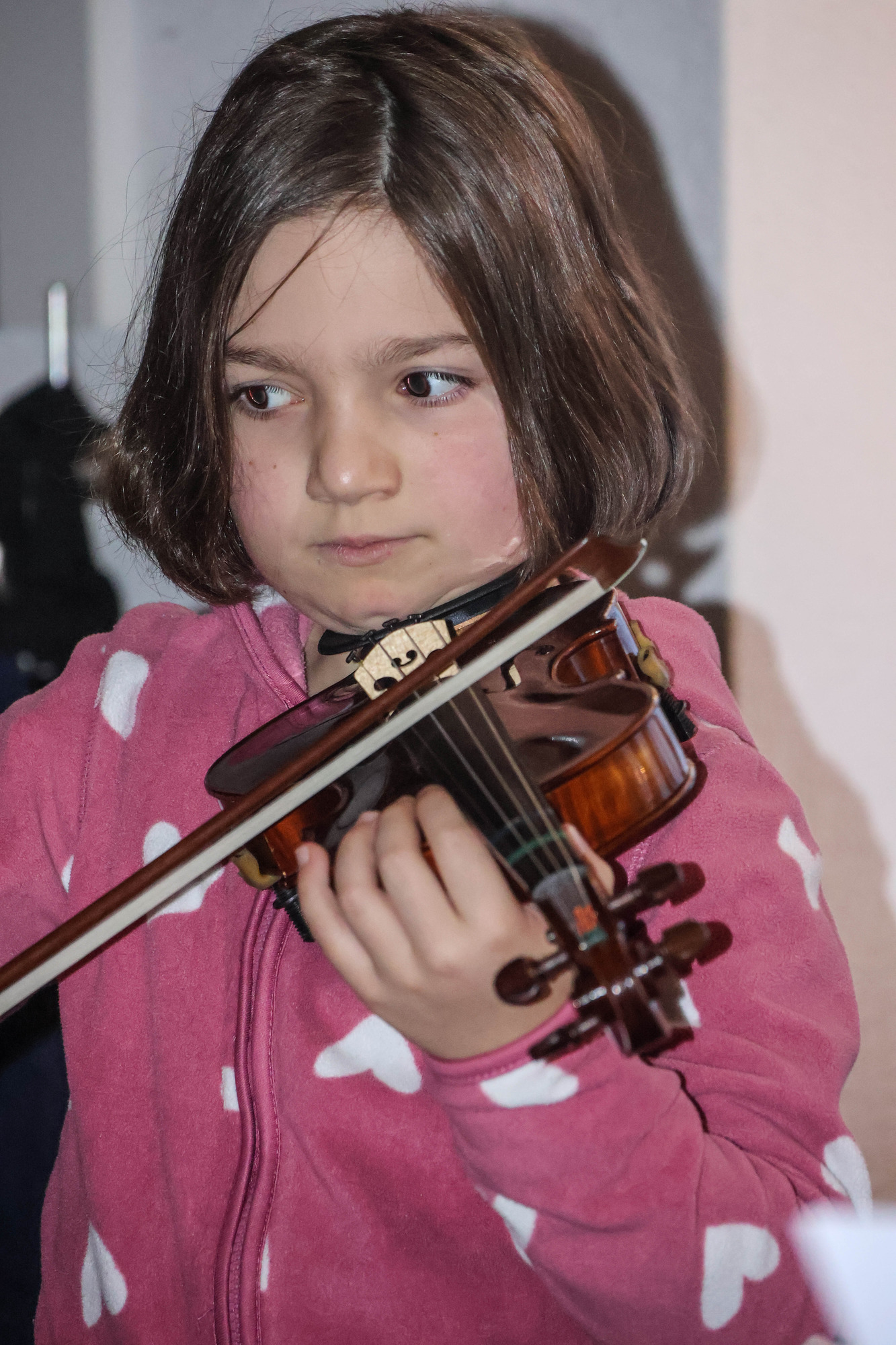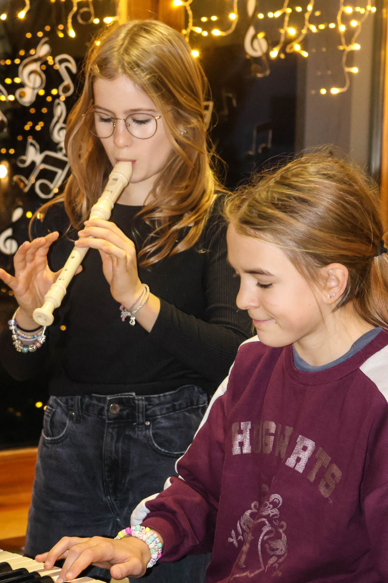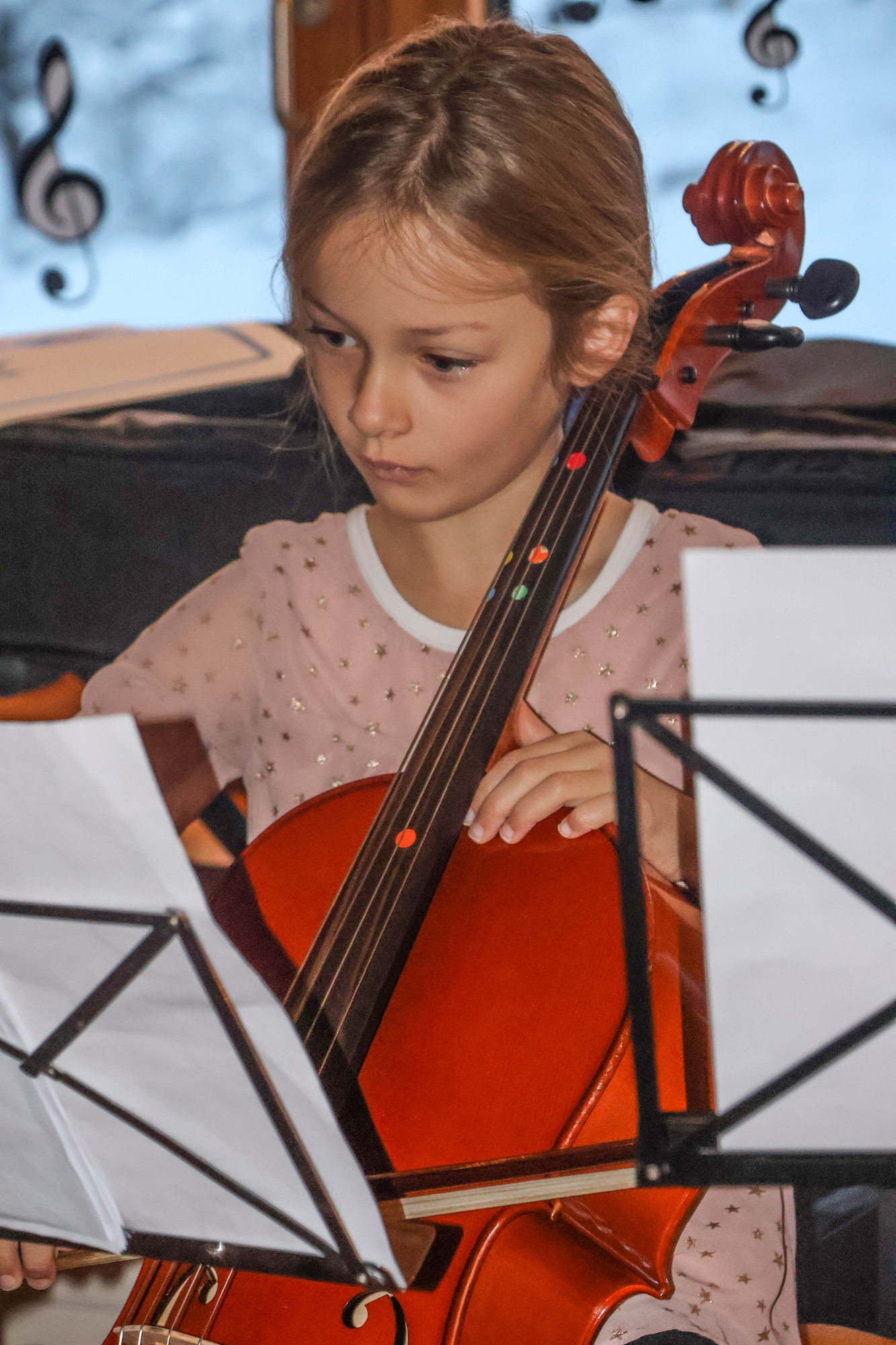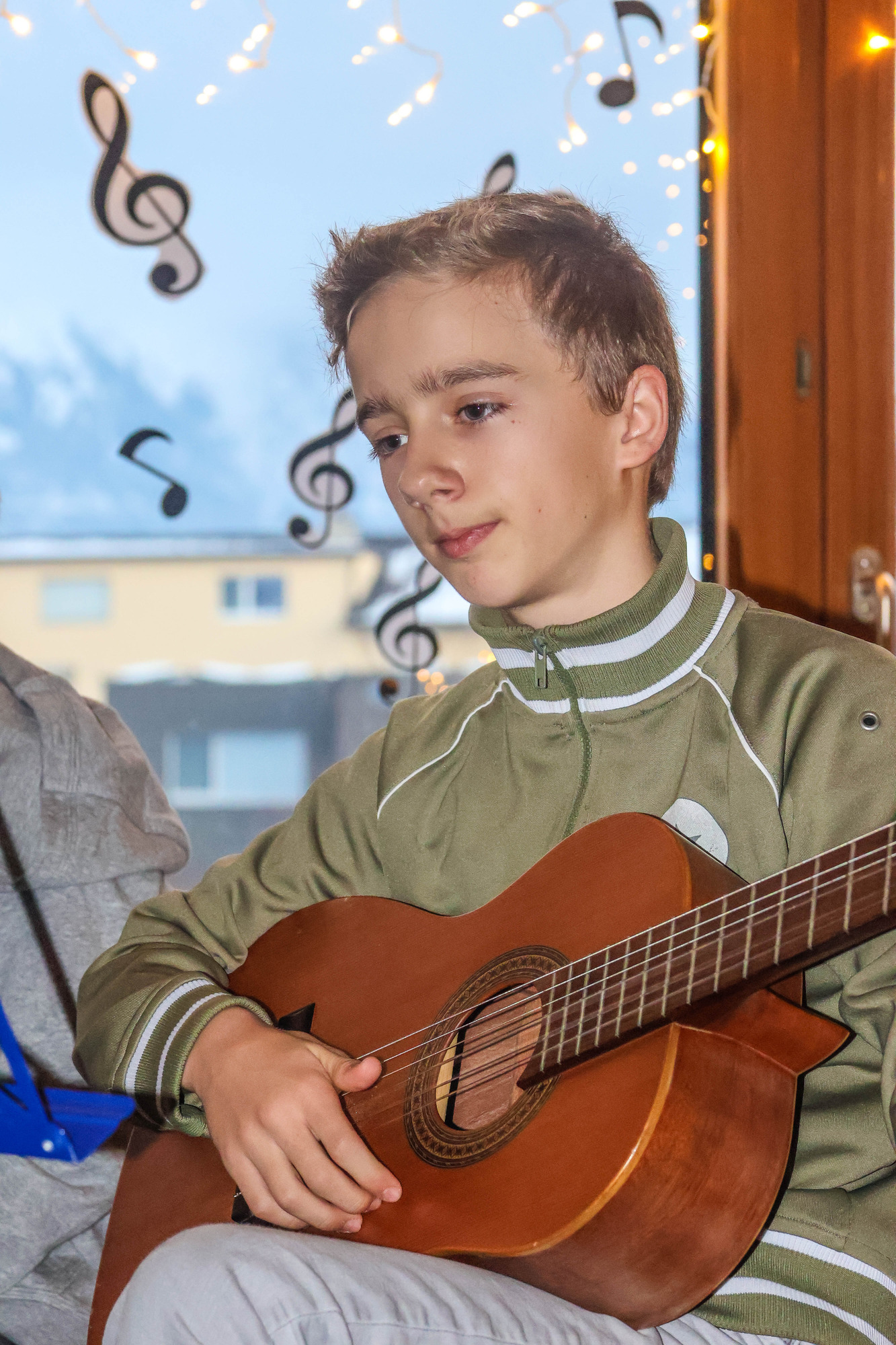 Im Hintergrund stand ein hübscher Weihnachtsbaum, der von den DaZ-Kindern und deren Lehrpersonen geschmückt wurde, und an den Fenstern hängen Lichter und Musiknoten – eine einladende Atmosphäre zum Musizieren und Zuhören.