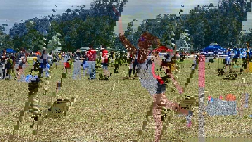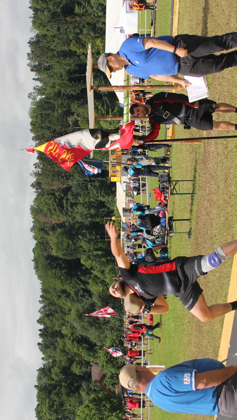 Die Ersten auf dem Wettkampfplatz waren die vier Kampfrichterinnen, ohne deren Einsatz eine Teilnahme nicht möglich wäre. Anfangs bei strömendem Regen, nachher zumindest vom Himmel her trocken startete der erste Wettkampfteil: Steinstossen und Gymnastik Kleinfeld. Die zwei Steinstösserinnen und drei Steinstösser des STV Sax brillierten in dieser Disziplin einmal mehr und holten die Bestnote 10.