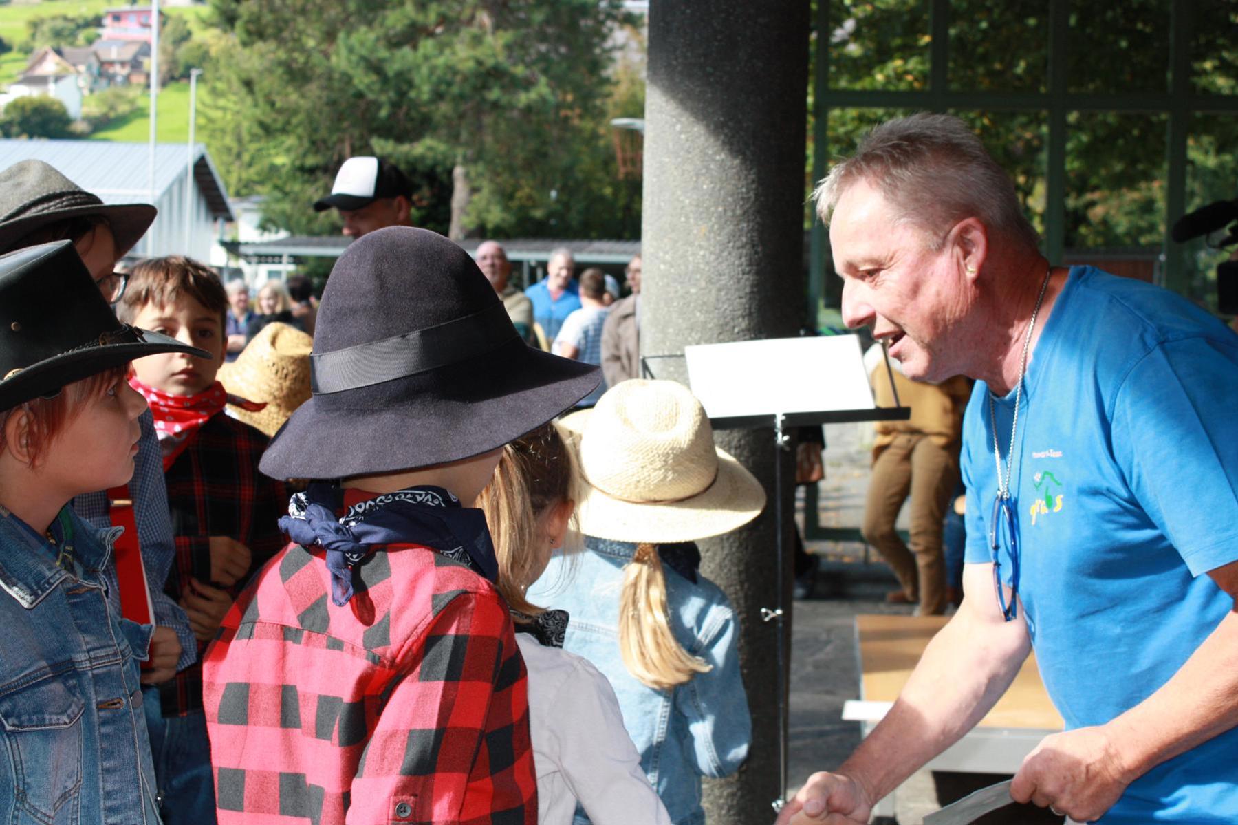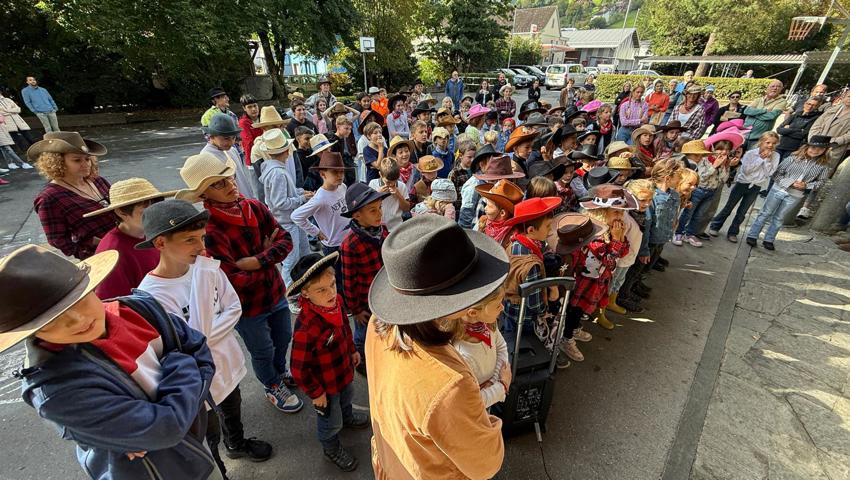 Zu seinen Ehren verwandelten sich Kinder und Lehrpersonen aller Klassen in eine bunte Schar von Cowboys und Cowgirls und führten einen Linedance zu «Cotton Eye Joe» vor und sangen «Du bisch de Champion, Peter» zur bekannten Melodie der Popband Queen.