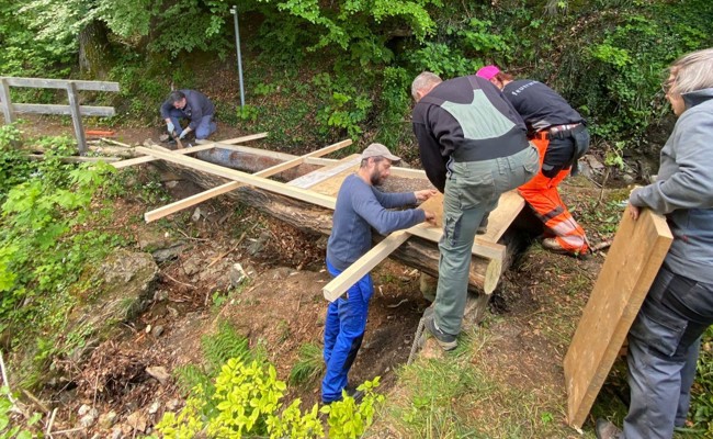 Im Bruschaberg und beim Surberg wurden Holzbrücken wieder instand gesetzt. Vom Fuchser bis zum Stampf wurde der Wanderweg gereinigt und freigeschnitten. Und zum Abschluss wurde entlang des Schluchtenwegs noch ein Zaun repariert. Am frühen Nachmittag waren mehr Arbeiten als erwartet erledigt und das verdiente Mittagessen wartete auf die hungrigen Arbeitskräfte.