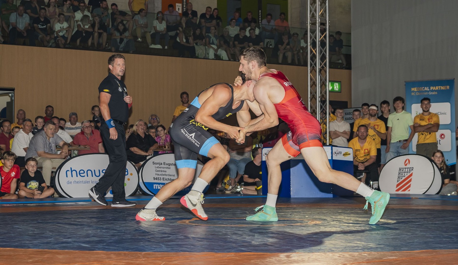 Anschliessend sahen die Fans bis 65 kg ein tolles Duell zwischen den Nati-Kaderringern Tinio Ritter und Sandro Hungerbühler. Der Kriessner punktete mehrmals mit seinen blitzschnellen Zweibeinangriffen, doch auch Ritter holte in der zweiten Halbzeit mehrmals mit erfolgreichen Beinangriffen Punkte. Zum Schluss gewann Hungerbühler den Kampf mit 10:5. So lag das Heimteam RC Oberriet-Grabs zur Pause mit 4:12 im Rückstand.