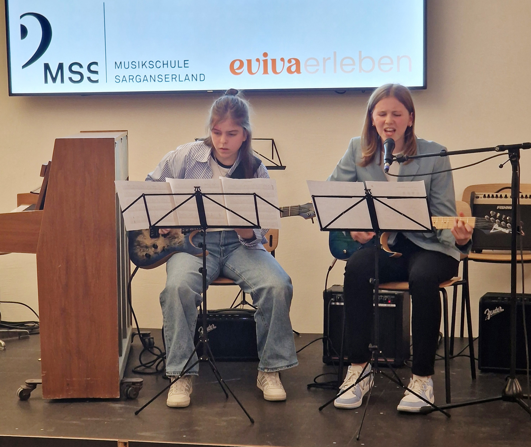Akkordeonstücke, vorgetragen von Kevin Azirovic, begleitet auf der E-Gitarre von Jerguš Drábik, eröffneten das Konzert. Samia Hug und Skyla Kessler spielten vierhändig auf dem Klavier. Popsongs, gesungen von Sarina Vorburger, «Rolling in the Deep», gespielt auf der Trompete von Jonas Gubser, «Creep» von Radiohead, präsentiert von den E-Gitarristinnen Nola Rothenberger und Alea Willi, sowie «Hollywood Hills», gespielt von Adriano Matteacci auf seinem Keyboard, waren der modernere Teil des Programms.