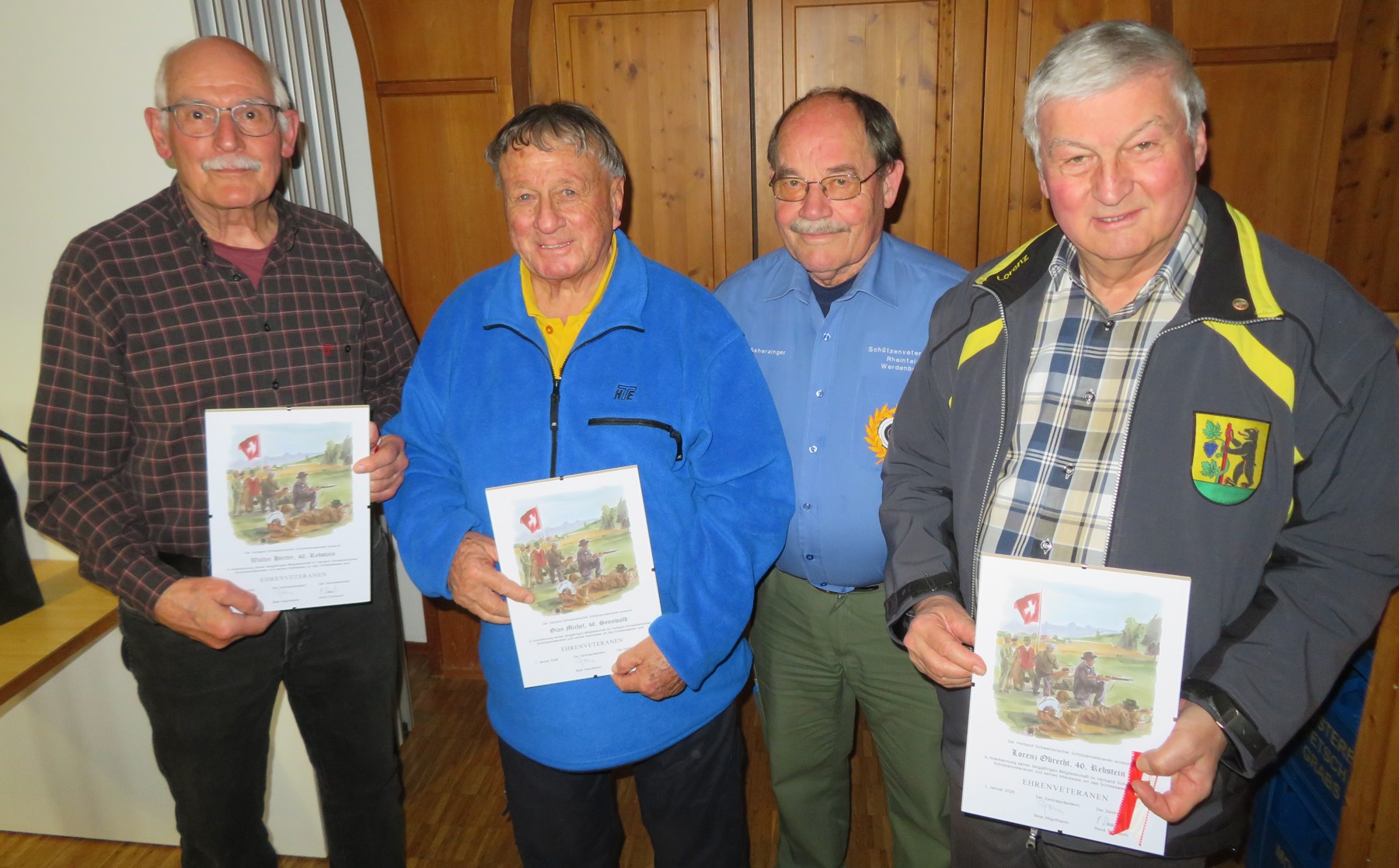 Für die Veteranenmeisterschaft erhielten die Ersten auf 300 Meter (Fredi Sonderegger, Florian Vetsch, Hans Nüesch) und 25 Meter (Hanspeter Kobelt, Theo Dietschi, Paul Stieger) eine Kranzkarte. Die zweite Feldmeisterschaft erhielten Josef Lenherr und Heini Rhyner. An der Schweizerischen Veteraneneinzelmeisterschaft erreichte Hans Nüesch in der Kat. A 196 Punkte, Robert Bösch in der Kat. D 189, Alfred Sonderegger in der Kat. E 184. Mit der Pistole 25 Meter erreichte Theo Dietschi 195 Punkte, Josef Kläger auf 50 Meter 186.