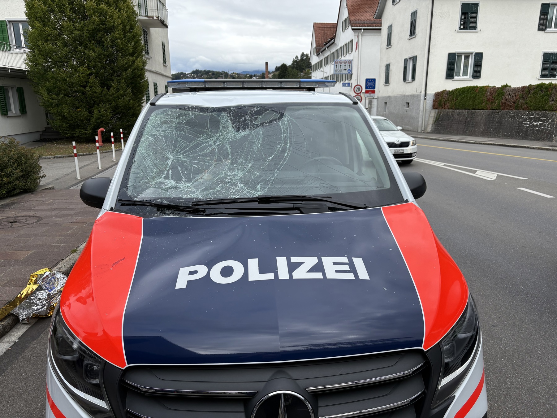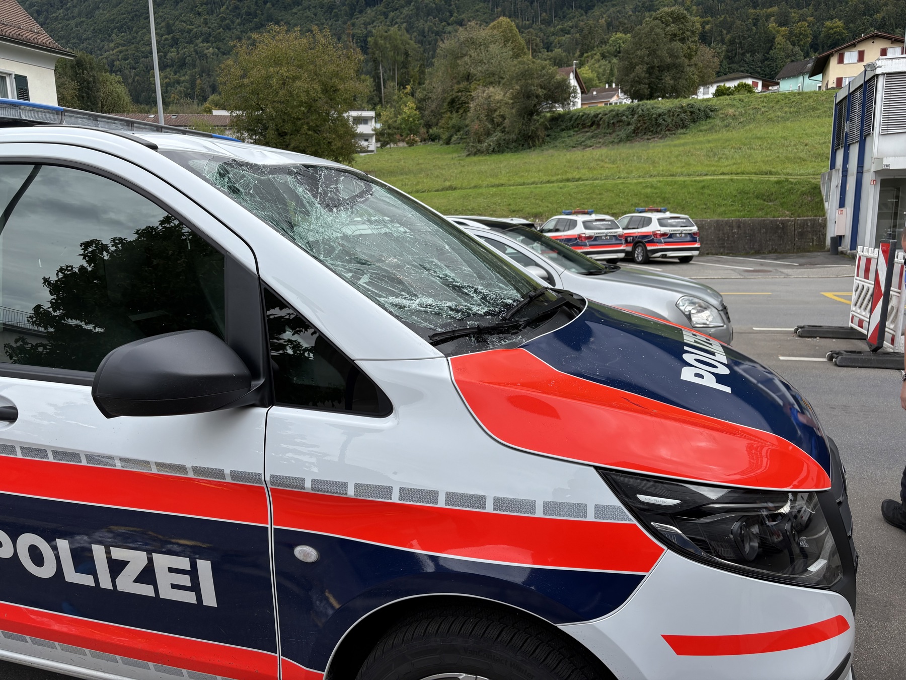 Ein alkoholisierter Fahrzeuglenker verhielt sich während des Gesprächs plötzlich unkooperativ und rannte unvermittelt über eine Treppe vom Erdgeschoss ins Obergeschoss des Grenzgebäudes. Dort öffnete er ein Fenster, betrat das Vordach, sprang von diesem hinunter und landete direkt auf dem Patrouillenfahrzeug der Landespolizei. Dabei wurde das Patrouillenfahrzeug der Landespolizei erheblich beschädigt und war nicht mehr fahrbereit.