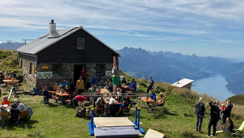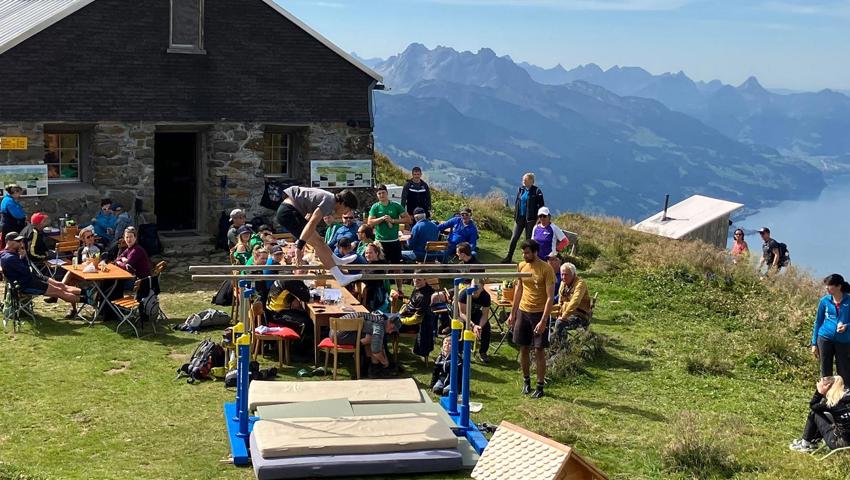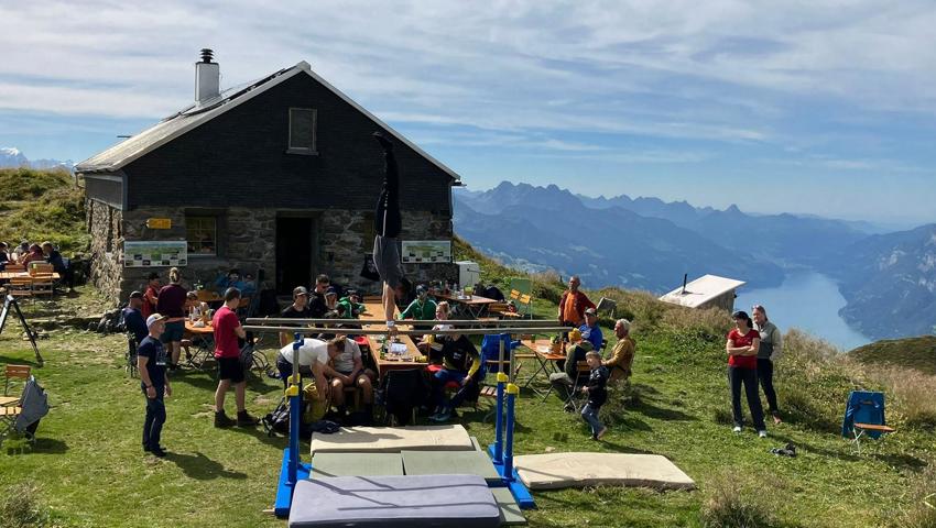 Für die Turner ist es sehr speziell am ungewohnten Barren am ungewohnten Ort zu Turnen was auch mancher Besucher des Alviergipfels nicht erwartet, und zur Kamera greifen lässt.